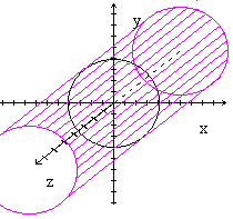 Ex 1. The purple lines in the picture are the rulings (generators) and the black circle is the generating curve in the infinite height right circular cylinder: