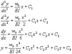 Ex1. A beam of length L is embedded at both ends, and the constant load w0 is uniform along its length. (I.e. w(x)=w0 for all x in the interval 0<x<L. Find the function representing the deflection of the beam.